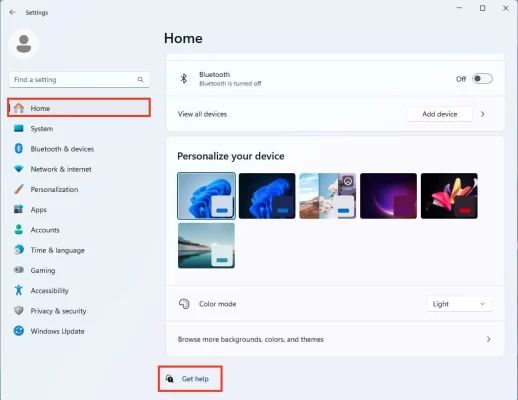 ไปยัง Go to the “Home” section, เลื่อนลงมา เเล้วเลือก “Get Help”